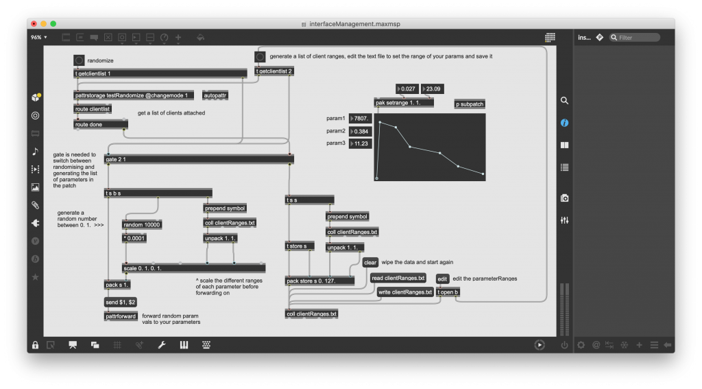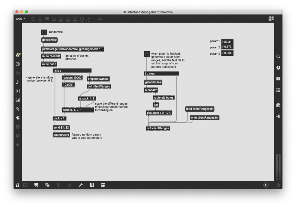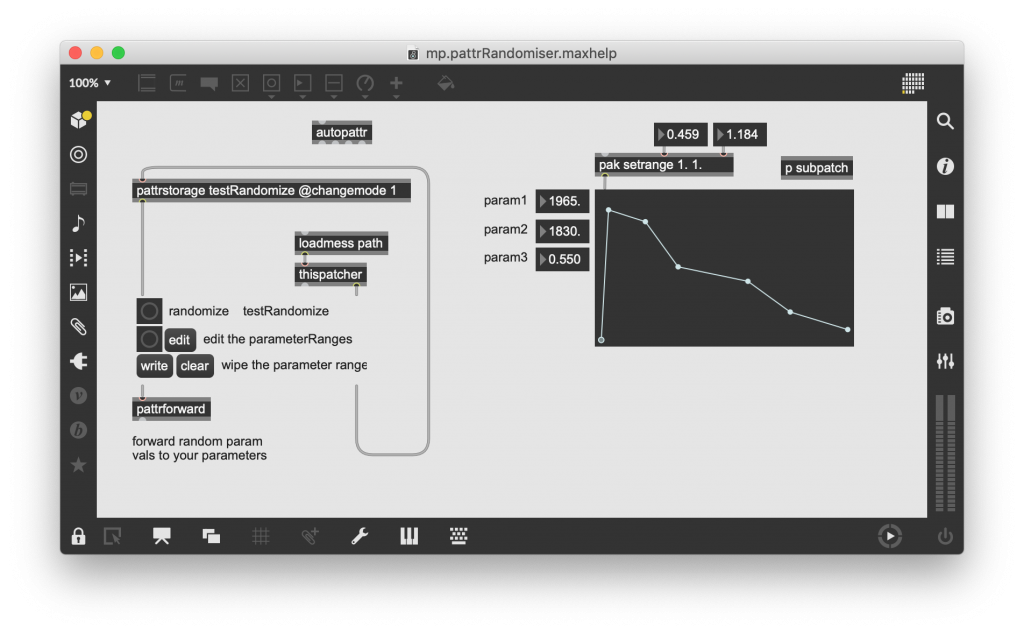 If you understand the above and tihnk you’d like to use a randomizer for your patch parameters in a patch. Here it is encapsulated into a an abstraction. Connect it to a pattrstoarage object, edit the parameter ranges and away you go. Automated randomizing across your whole set of parameters. This is a very good way of finding the tolerances and ranges of your patch that you like and discovering connections and sounds that you can’t get by trial and error.